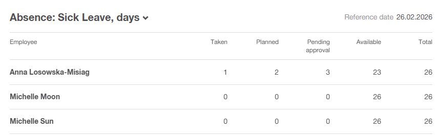 The employee dashboard now features a new widget that displays absence details per user and per type. It highlights the amount of time already taken (before the reference date), planned (after the reference date), pending (not yet approved), available (limit minus taken and planned), and the total limit.