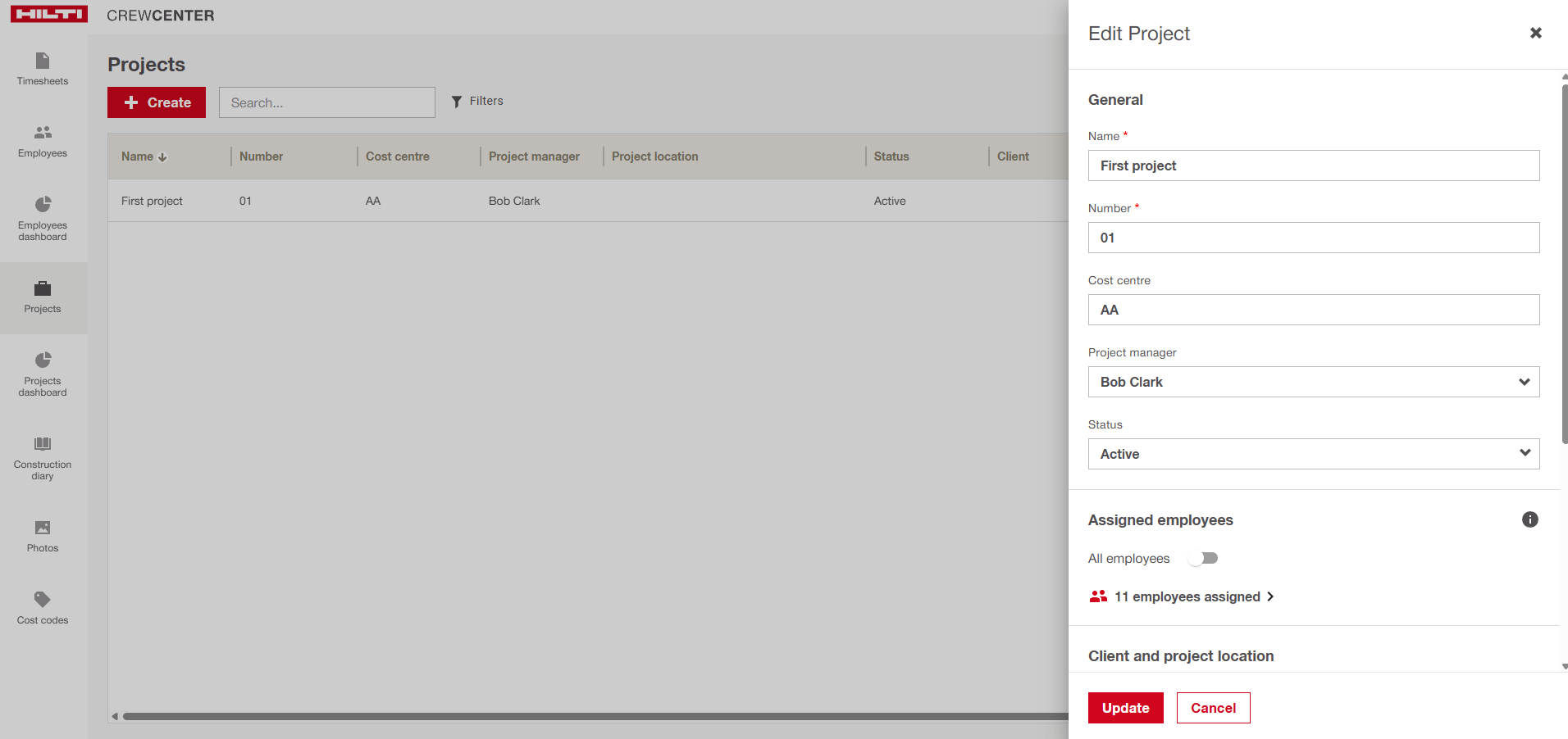 Open a project, disable the toggle to assign employees, and select the users you want to assign to this project (in bulk or individually).
