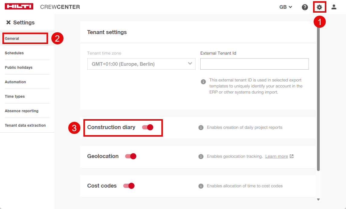 Turn ON the toggle for Construction Diary.