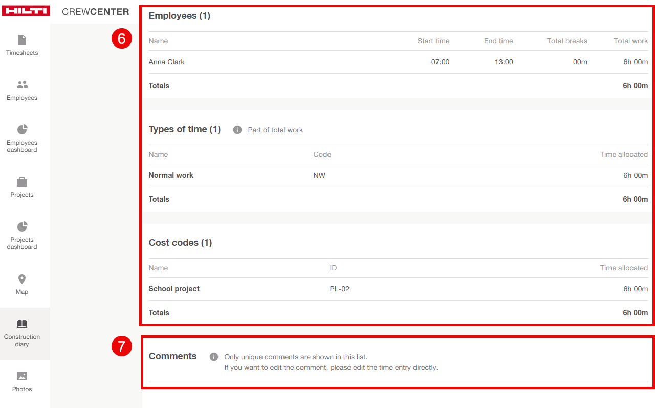 7. Employee comments are automatically included from Timesheet timecards.