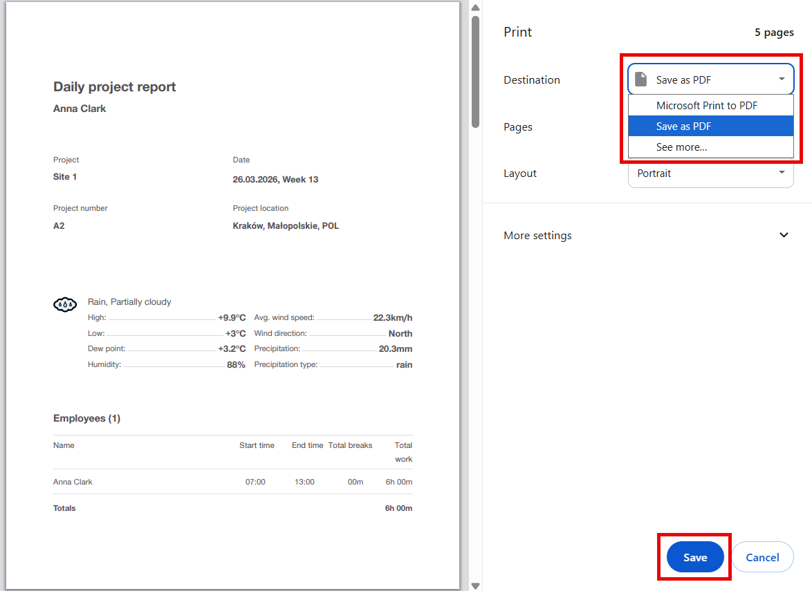 12. Click Save report to save for the project. Next time, current values will auto-populate.