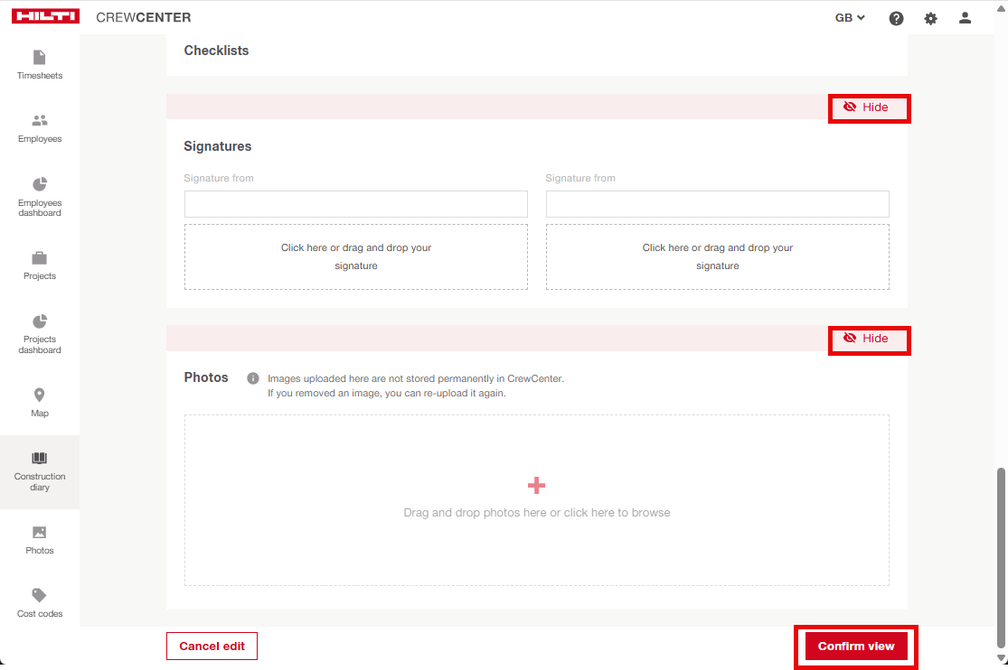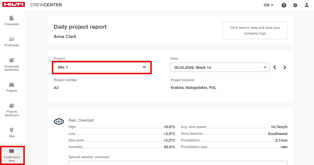 Log in to the web platform and select Construction Diary from the left-hand menu.