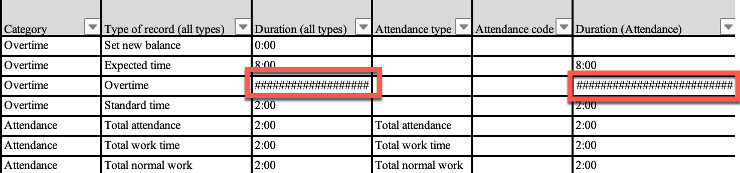 h:mm time format. The recommended workaround is to use the decimal h,mm format instead, which avoids the Excel limitation and correctly shows negative time values in CrewCenter exports.If your Excel export shows ############################ for time values:
