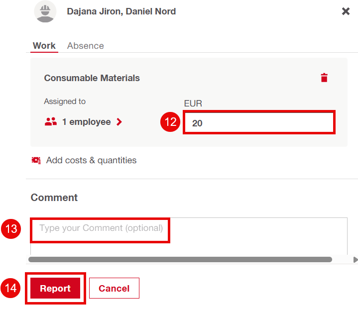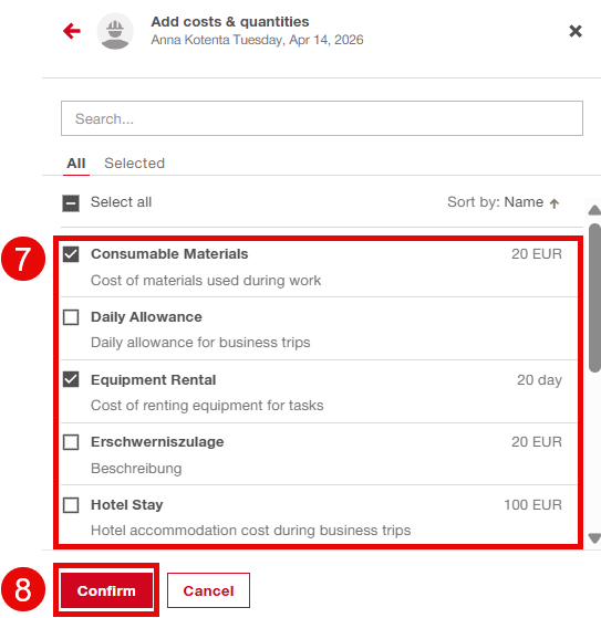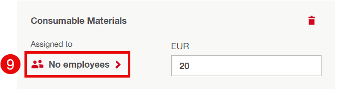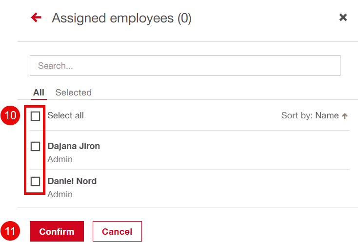 Press "No employees" to assign employees. Here, the user can choose which employees to assign costs and quantities to.