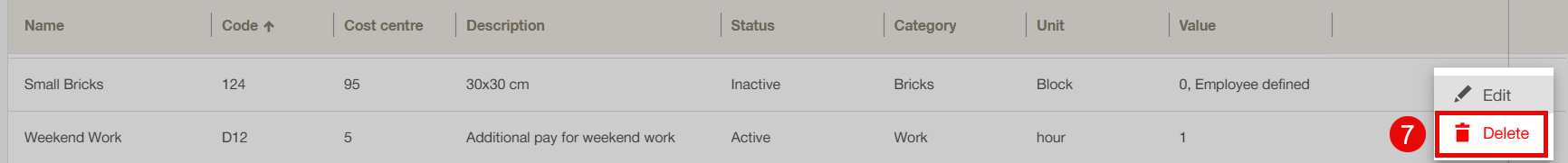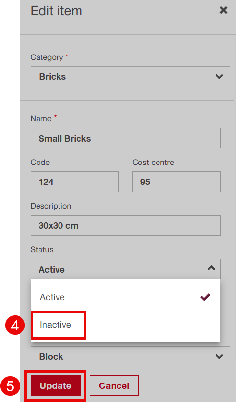 To delete Costs & Quantity, the admin must first mark the item as inactive.