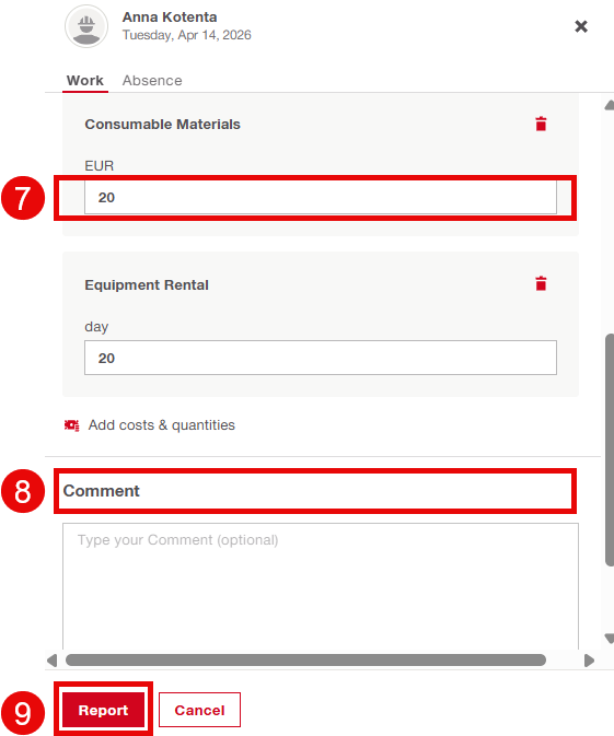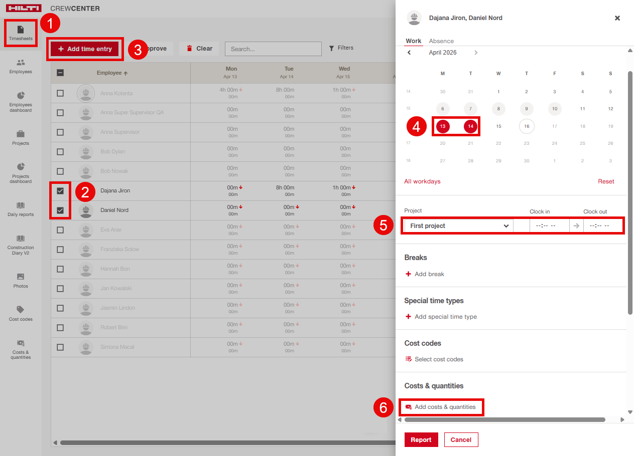 - Choose the days for which you want to add time, costs and quantities.