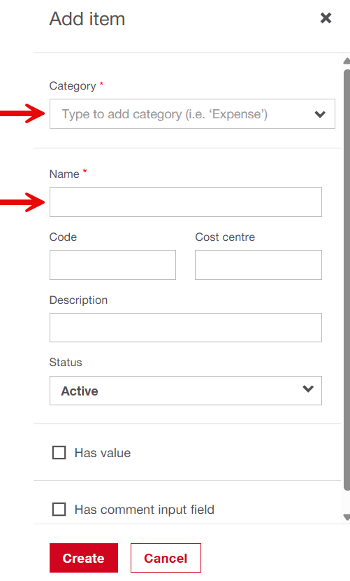 Click Create at the top of the page: the "Add Item" panel opens as a side window.