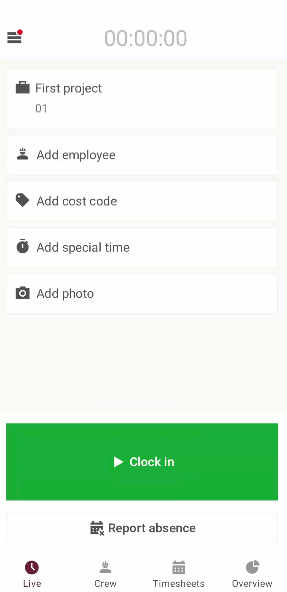 - Select a Project, then enter the Clock In and Clock Out times.