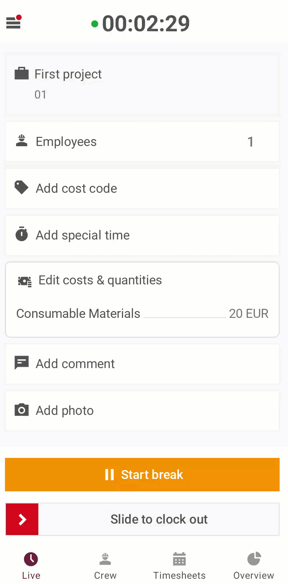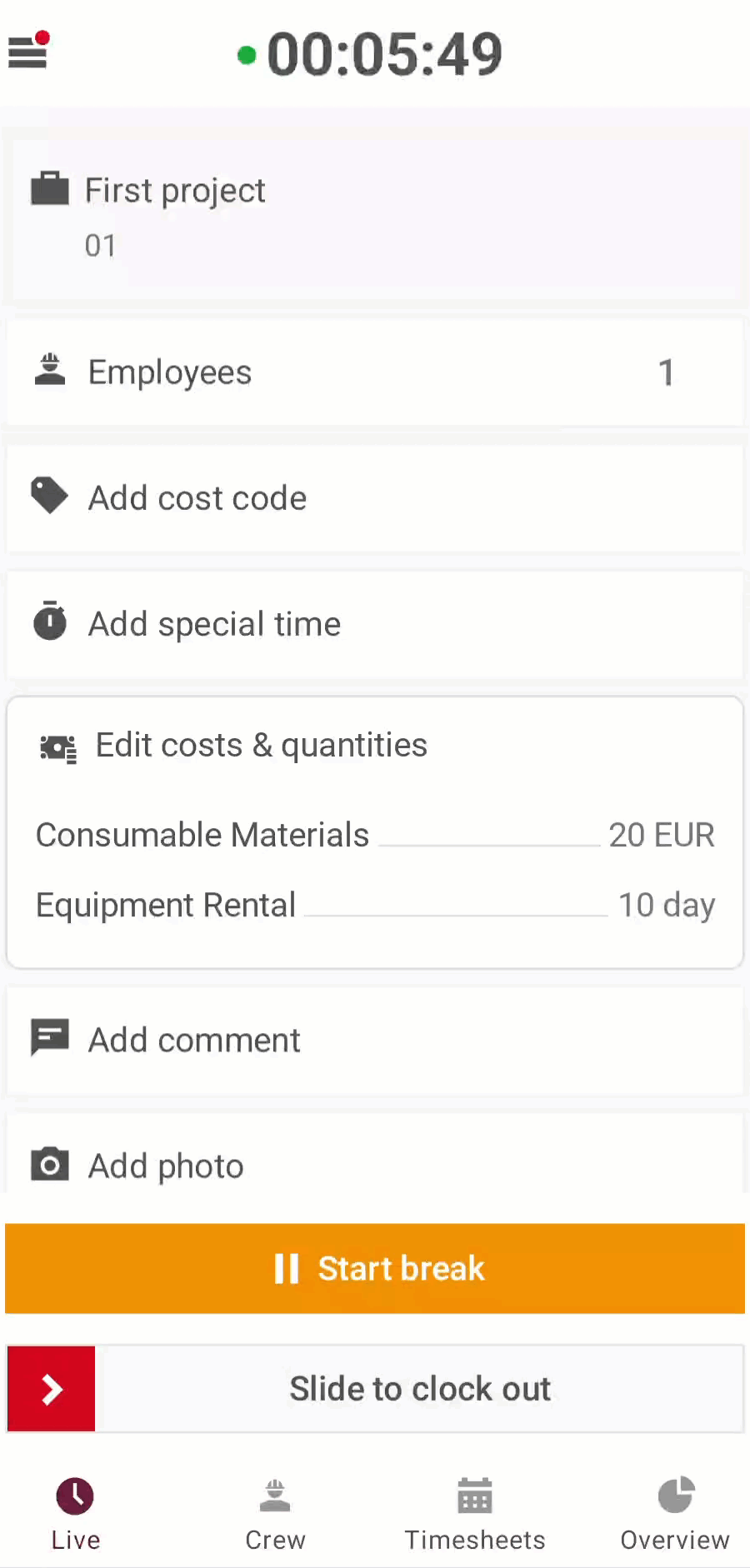An admin and supervisor can add Costs & Quantity values to a single timesheet entry - for themselves or for any employee within their account.