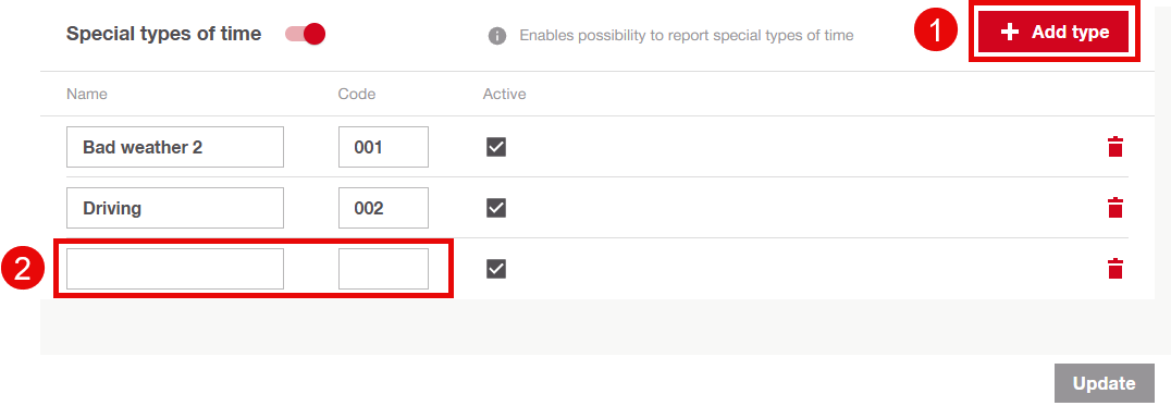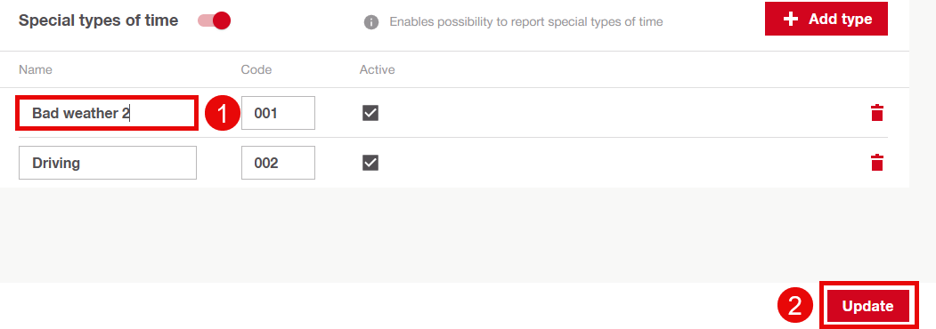 To edit an existing special time type, the user can modify its Name and/or Code. When changes are detected, the Update button will appear. Click Update to save the changes.