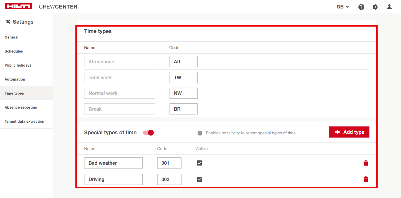Note: The Code is used in the exported timesheet to identify the specific time type.