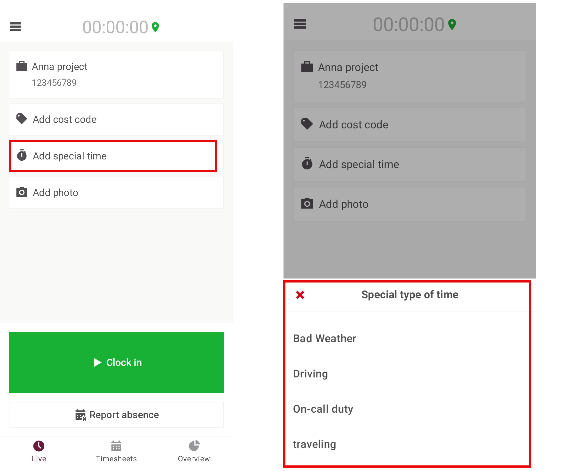Employees can select Special Time types when clocking in or out or when entering time after hours. This ensures all work performed, including activities outside regular duties, is tracked. Special Time types help organizations comply with labor regulations and analyze time allocation across different activities.