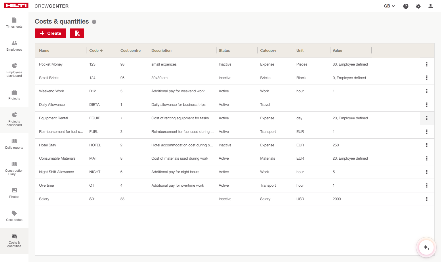 On the web, Administrators have full control over configuration and management. This includes a dedicated management page where they can create, edit and organize costs and quantity types, maintain naming consistency and manage availability across projects and teams.