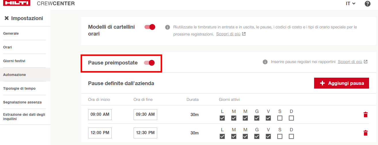 Quando attivate, le pause appaiono automaticamente nei giorni e orari selezionati, basandosi sulle impostazioni dell'utente o dell'azienda.