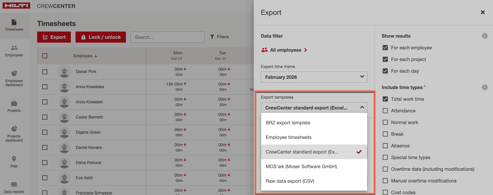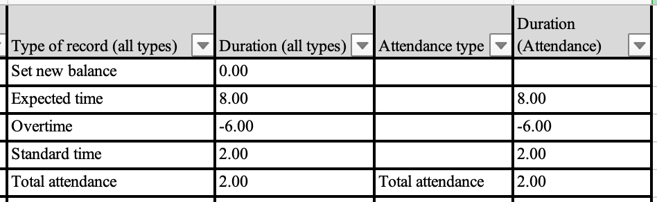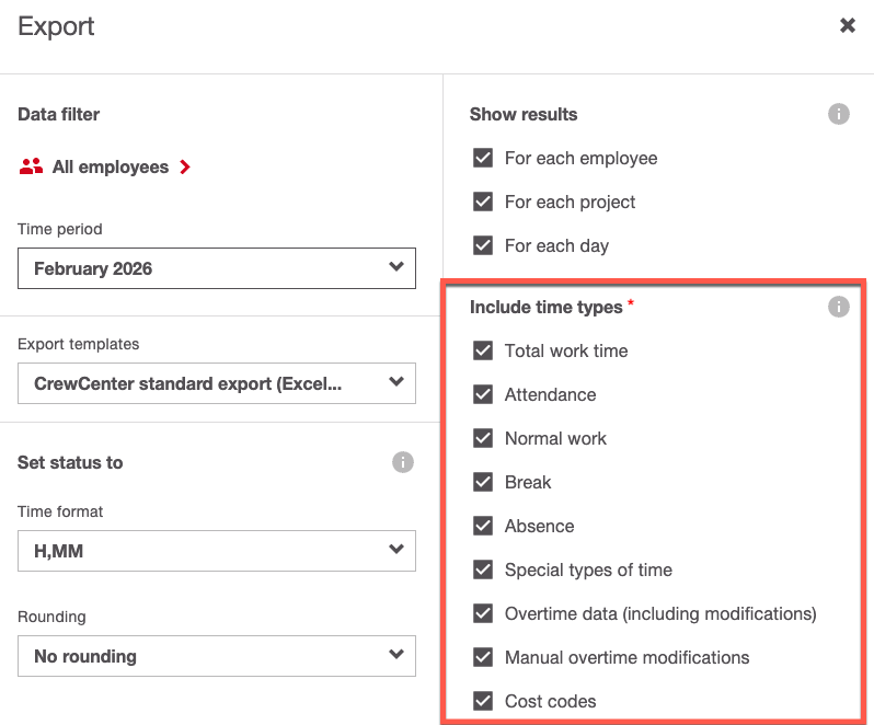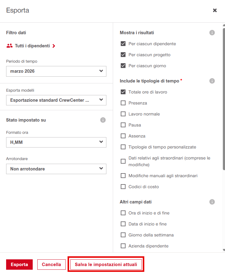 Includi tipi di tempo: Tempo totale di lavoro, Presenza, Lavoro normale, Pausa, Assenza, Tipologie di tempo personalizzate, Dati relativi agli straordinari (incluse modifiche), Modifiche manuali agli straordinari, Codici di costo