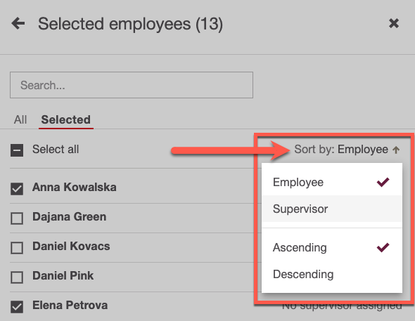 Opzioni di ordinamento: Ordina per dipendente o per supervisore, in ordine ascendente o discendente.