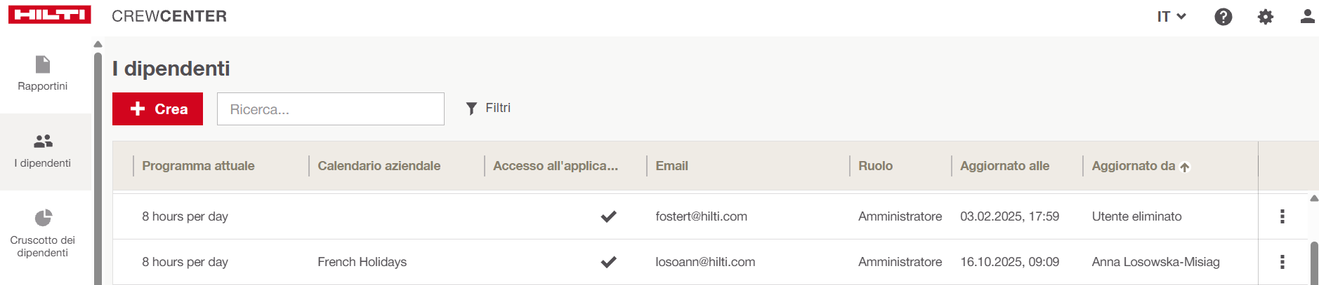 In CrewCenter non è possibile modificare direttamente l’indirizzo e‑mail di un dipendente dopo la creazione dell’account.