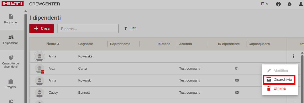 Nota: Un dipendente non può essere modificato, archiviato o eliminato se l’ultima modifica del profilo è stata effettuata da un utente che non esiste più nell’azienda (utente eliminato).