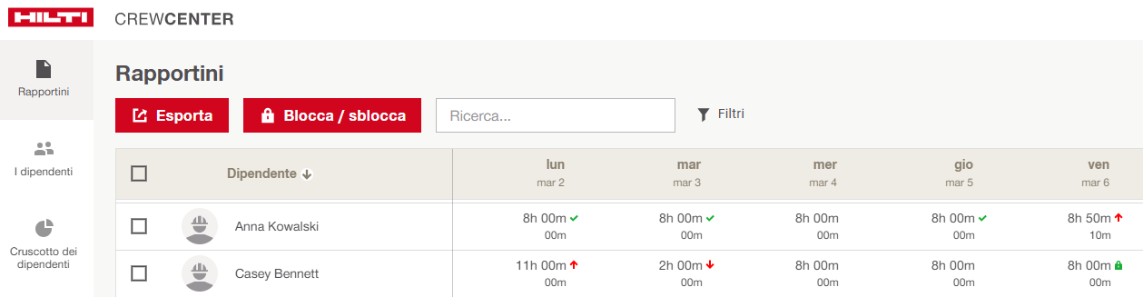 La scheda Timesheets in CrewCenter fornisce una visualizzazione settimanale delle voci di tempo per ogni dipendente. Varie icone e evidenziazioni aiutano gli utenti a identificare rapidamente lo stato delle voci di tempo e a individuare deviazioni dal lavoro o dalle pause pianificate.