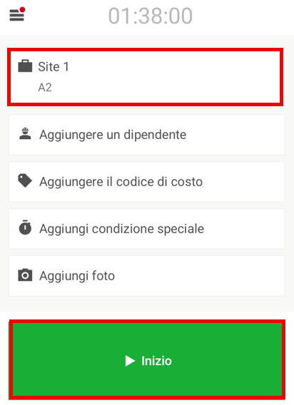 Toccare il pulsante "Inizio" per la timbratura ingresso al centro dello schermo. Il monitoraggio del tempo inizia immediatamente.