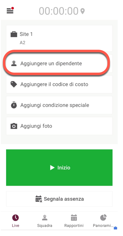 Toccare il pulsante "Inizio" per la timbratura ingresso in fondo allo schermo per iniziare il monitoraggio per i membri della squadra selezionati.