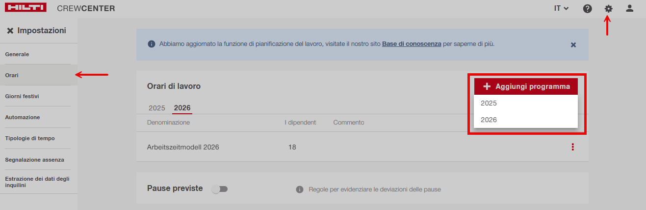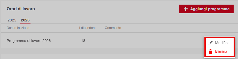 Nota: Puoi creare più programmi di lavoro per lo stesso anno (ad esempio, Full-time ufficio, Full-time cantiere, Part-time). Ogni dipendente può essere assegnato a un solo programma per anno.