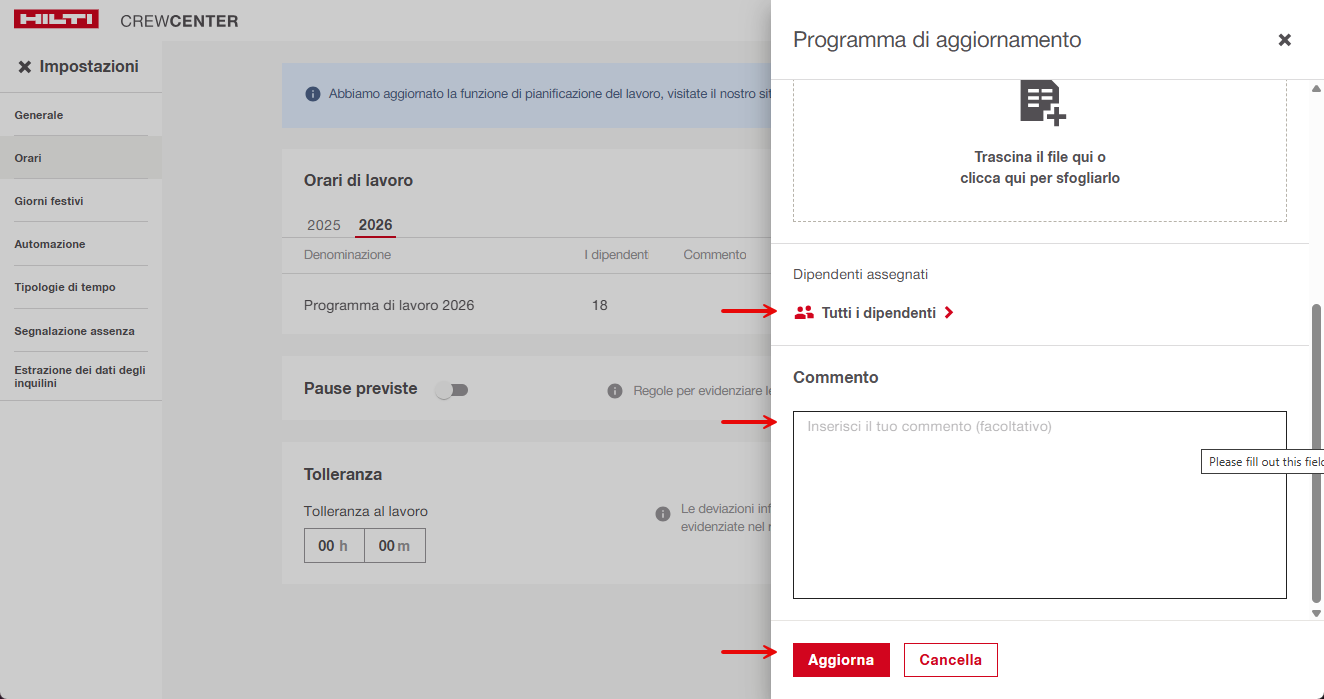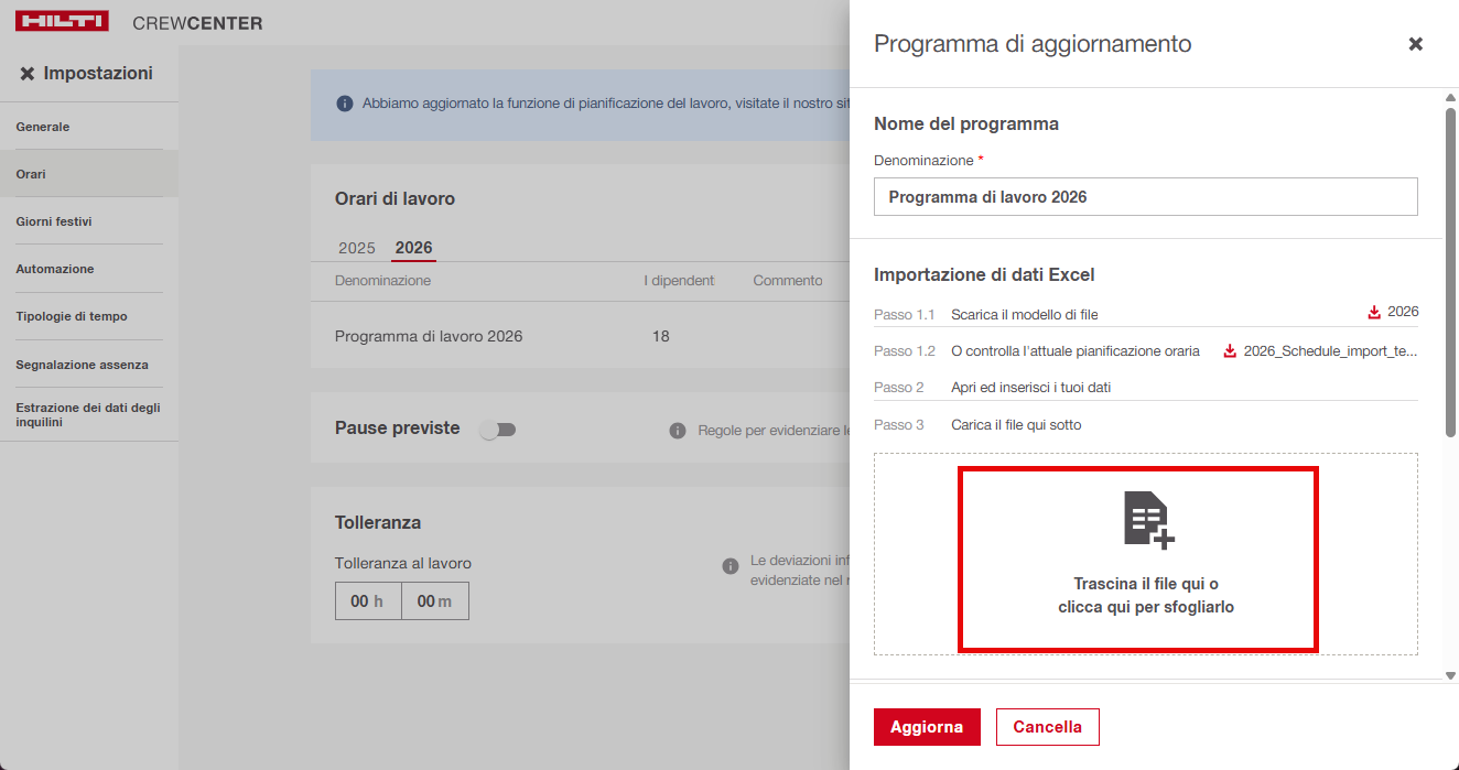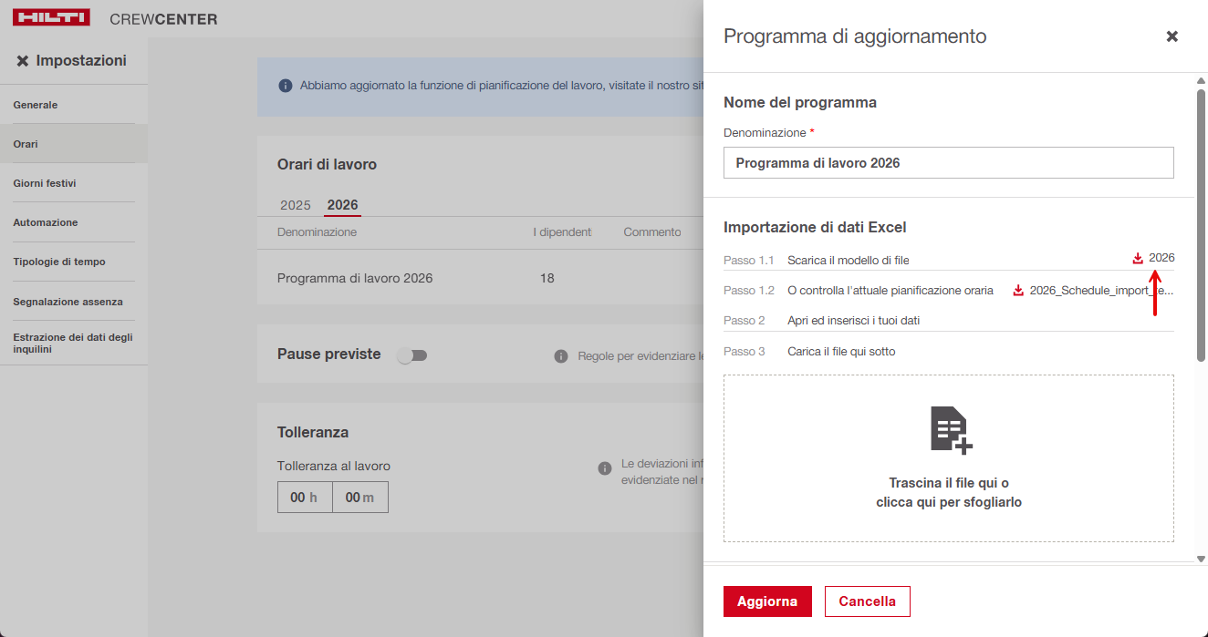 Il Programma Annuale di Lavoro in CrewCenter consente agli amministratori di definire le ore di lavoro previste per ogni giorno dell'anno.