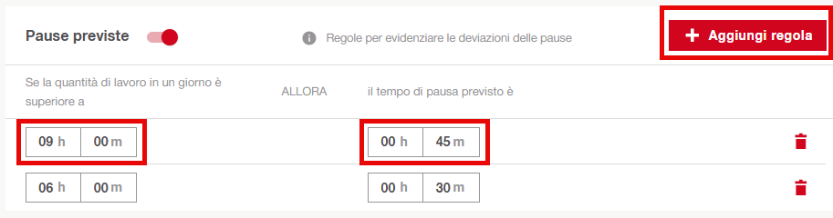 Le regole di pausa definiscono il tempo di pausa previsto basato sul tempo di lavoro registrato e sono gestite a livello di tenant.