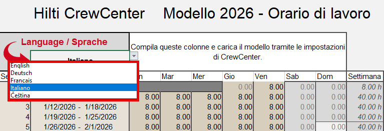 Per cambiare la lingua, clicca sulla cella in alto a sinistra del foglio di lavoro e seleziona la lingua preferita dalla lista.