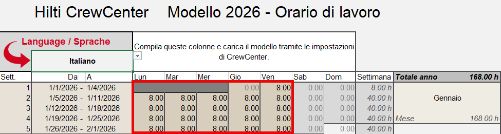 4. Apri il file e inserisci le ore previste per ogni giorno della settimana in Excel per tutto l'anno e carica il file Excel completato.