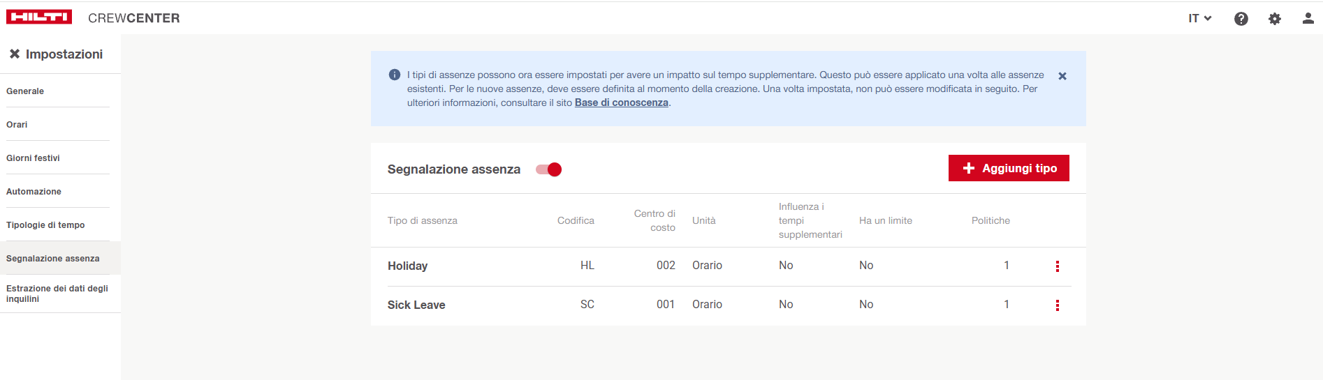 - Il nuovo pannello laterale permette agli amministratori di aggiungere, modificare ed eliminare i tipi di assenze individualmente.