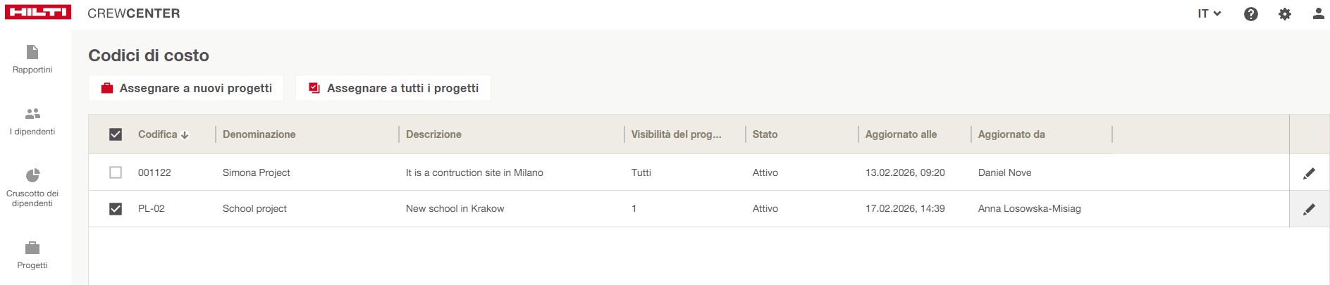 È ora possibile assegnare contemporaneamente più codici di costo a uno o più progetti.