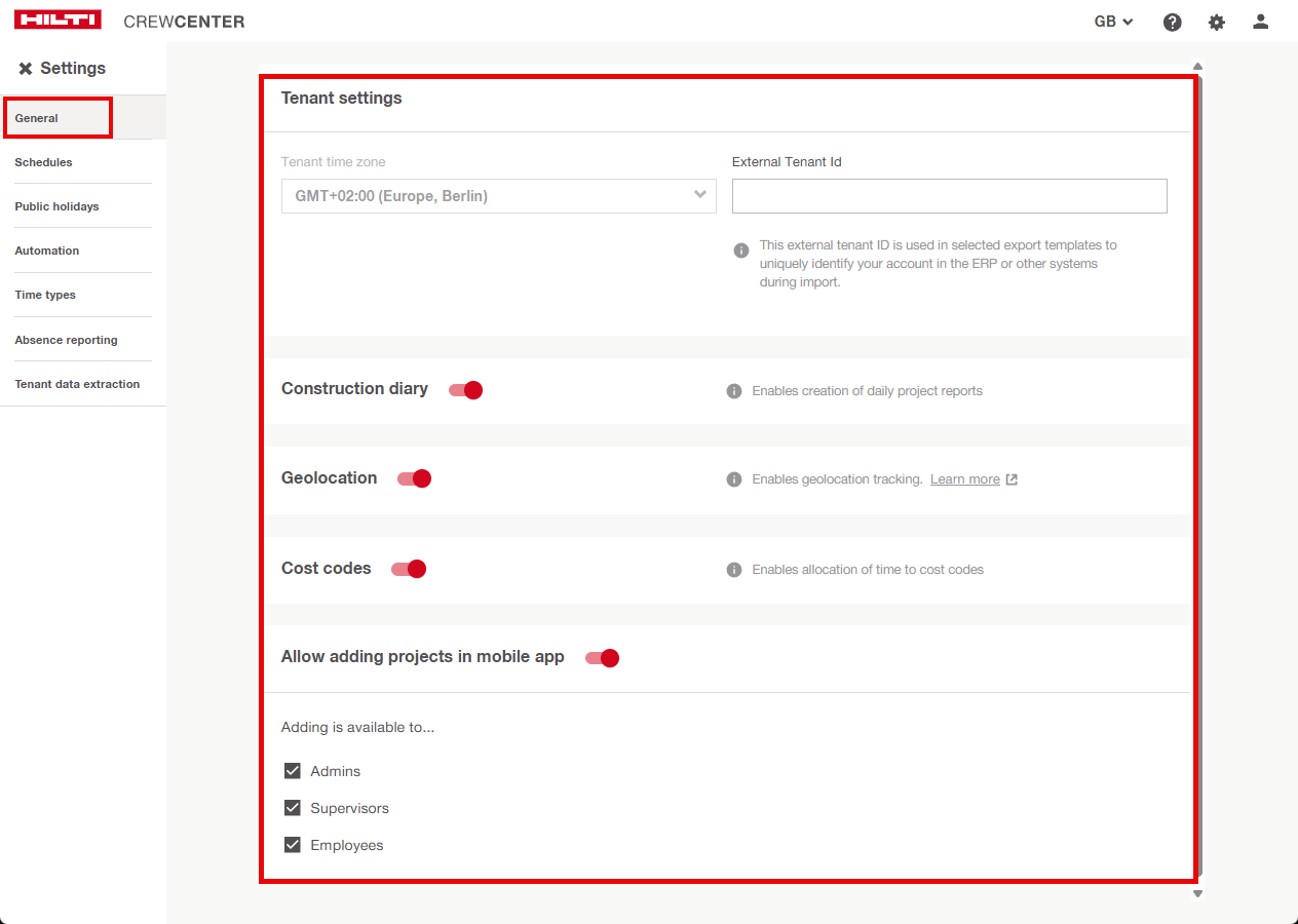 Inoltre, l'amministratore può decidere se consentire l'aggiunta di progetti tramite l'app mobile per amministratori, supervisori e dipendenti.