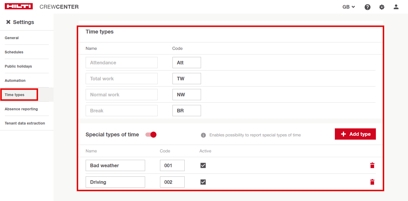 I Tipi di Tempo Speciali sono categorie usate per registrare ore di lavoro non standard, come il tempo di guida, la formazione o altre attività che non sono ore lavorative regolari o pause. Questi tipi sono disponibili per la selezione quando i dipendenti registrano il loro tempo in CrewCenter, facilitando la cattura di tutte le attività lavorative rilevanti.