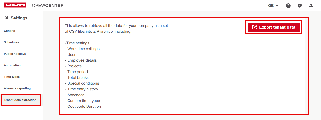 Le impostazioni dell'account e i dati - inclusi orari di lavoro, pause, assenze e codici di costo - vengono esportati quotidianamente come file CSV per scopi analitici.