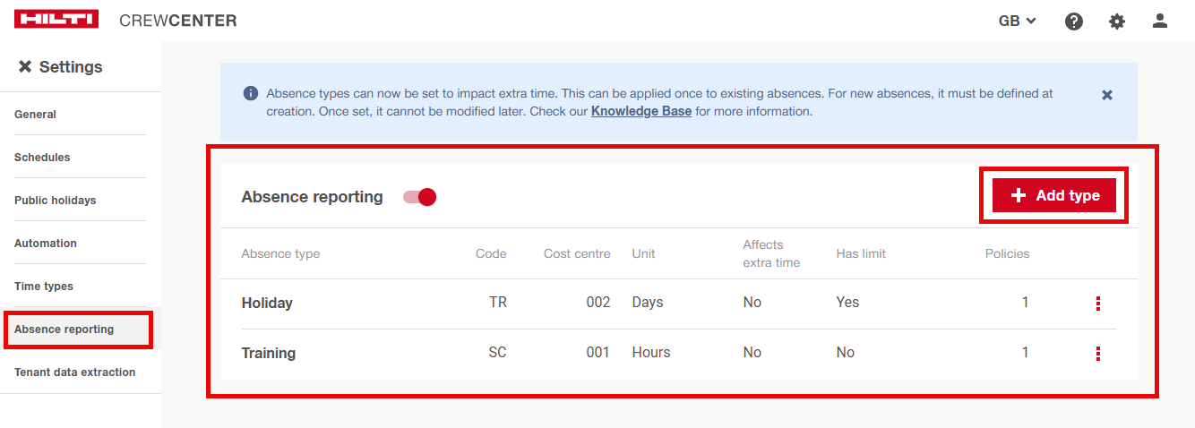 Gli admin possono definire tipi di assenza, impostare limiti annuali, assegnarli a dipendenti o gruppi e decidere se i commenti sono obbligatori. La gestione delle assenze è disponibile solo sul Web per la configurazione. Gli admin possono superare i limiti di assenza, poiché questi limiti servono come guida e non come limite rigido. Se la segnalazione delle assenze è disabilitata, gli utenti non possono creare nuove assenze e la scheda Assenze viene nascosta.